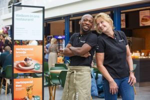 Omdat Bea al contacten met het Dijklander Ziekenhuis had, gingen zij en Maxo een keertje kijken bij de cafetaria in de centrale hal. “Eigenlijk wilde ik niet meer werken in een ziekenhuis”, zegt Maxo. “Maar ik voelde meteen dat dit bezoekersrestaurant heel anders was dan die keuken toen in Amsterdam. Er hoort een kiosk bij, dat vond ik ook heel leuk. En de mensen waren er meteen heel aardig. Die eerste dag heb ik meteen een beetje meegelopen. Bea zat een stukje verderop, als ik
